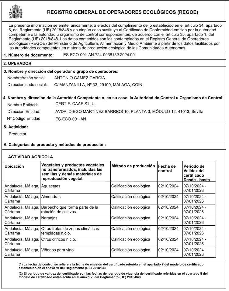 Finca ubicada en la ribera de Río Grande, perteneciente al sistema de regadíos del Guadalhorce. Contamos con certificado de producción ecológica nº ES-ECO-001-AN.724-0038132.2024.001 para todos nuestros cultivos.